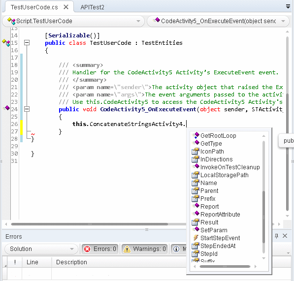 5. In the TODO section of the TestUserCode.cs file, use the this object to access the properties of the activity for which you want to set properties, using the following syntax: