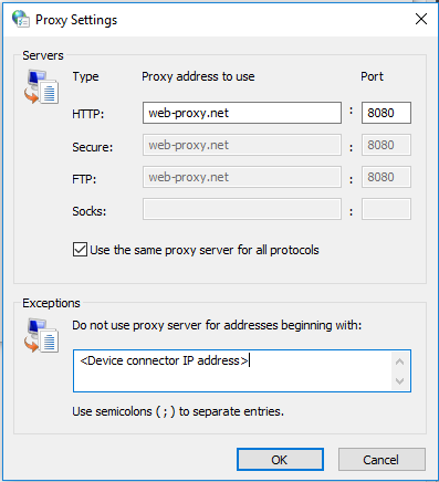Internet Options. Add the IP address of your device connector as an exception in your machine's Internet Options proxy settings (Connections > LAN settings > Proxy server > Advanced).