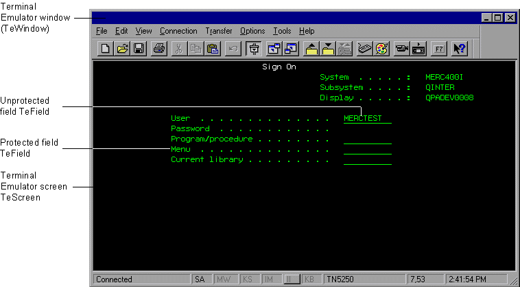When testing, OpenText Functional Testing distinguishes between the window of the terminal emulator and the screens in the host application. The terminal emulator window consists of the frame, menus, toolbar, and status bar of the terminal emulator itself. This window remains constant throughout each terminal emulator session.