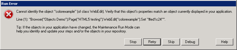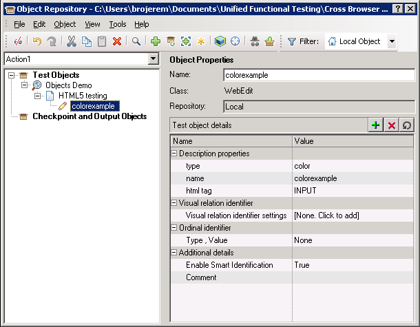 In the object repository, the Color field object is recognized as a WebEdit object with the name colorexample (as it was by the Object Spy):