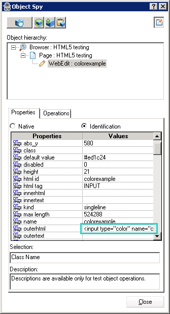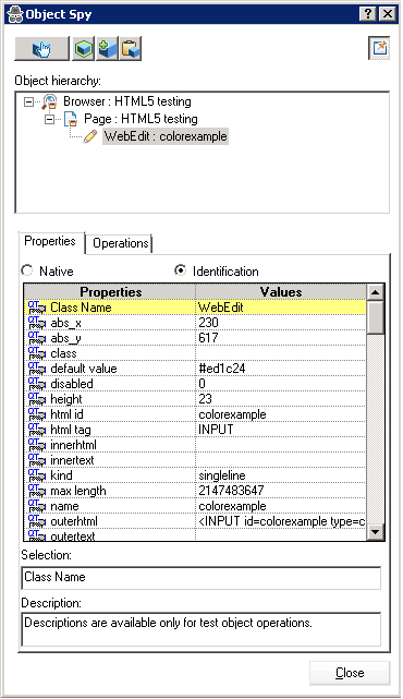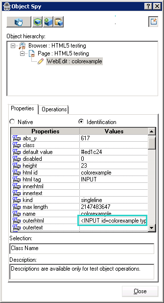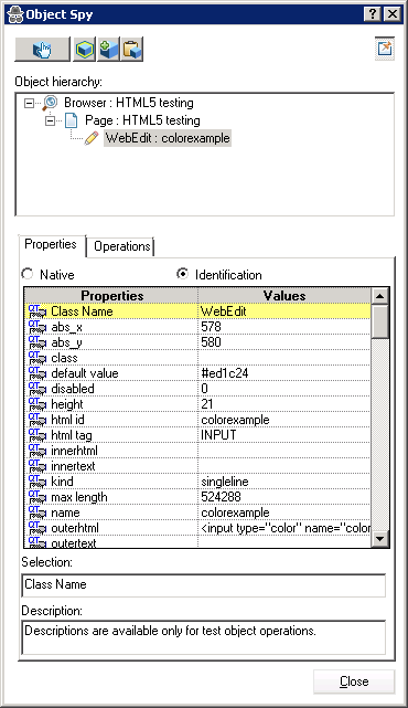 A closer look at the properties in the Object Spy for the colorexample object shows slight differences in the properties between Internet Explorer and Chrome: