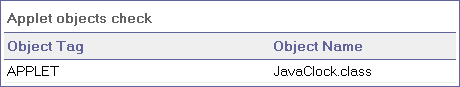 The Applet Check also helps you ensure that pages are accessible, even when newer technologies are not supported or are turned off (Guideline 6 of the W3C Web Content Accessibility Guidelines), by finding any Java applets or applications in the checked page or frame. The checkpoint passes if the page or frame does not contain any Java applets or applications. Otherwise, the results display a warning and a list of the Java applets and applications. For example:
