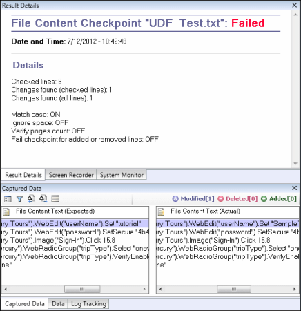 For failed steps, the Captured Data pane displays any differences found for all lines in the actual file, regardless of whether they were selected for comparison in the checkpoint. An asterisk (*) adjacent to the line number indicates that a regular expression was selected for comparison against the actual file.