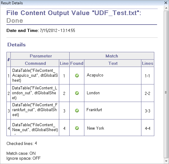 The Result Details pane displays the results of the file content output value step, including its status, the date and time the step was run, and details for the parameterized file content output value. This pane also shows the configuration settings (whether match case and ignore spaces were set), as shown in the following example.