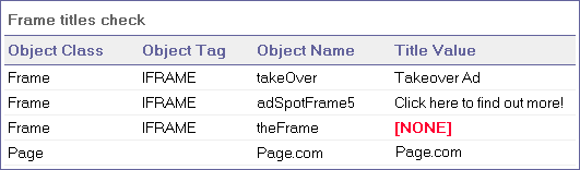 Guideline 12.1 of the W3C Web Content Accessibility Guidelines requires you to title each frame to facilitate frame identification and navigation. When you select the Frame Titles check, OpenText Functional Testing checks whether Frame and Page objects have the TITLE tag. If the selected page or frame and all frames within it have titles, the checkpoint passes. If the page, or one or more frames, do not have the tag, the test fails and the run result details display a list that shows which objects are lacking the tag. For example:
