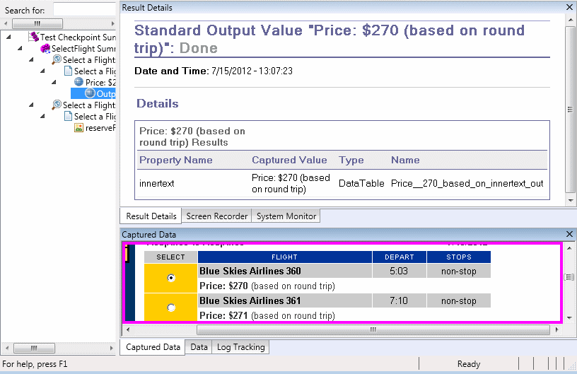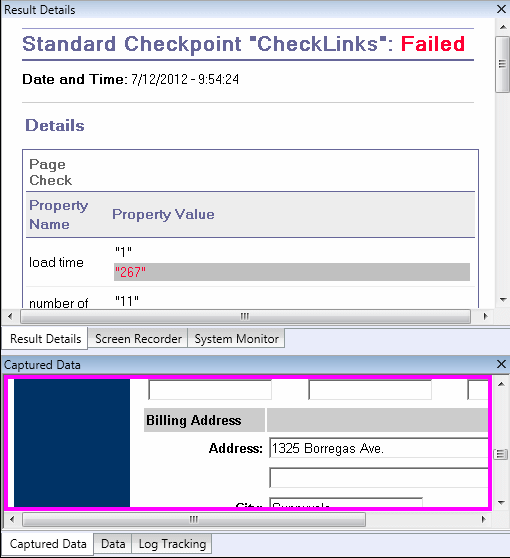 Note: By default, the information in the Captured Data pane is available only if the bitmap checkpoint fails. You can change the conditions for when bitmaps are saved in the run results, using the Save still image captures to results option in the Screen Capture pane (Tools > Options > GUI Testing tab > Screen Capture node) of the Options dialog box.
