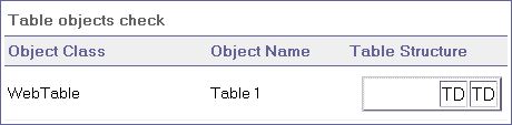 Guideline 5 of the W3C Web Content Accessibility Guidelines requires you to ensure that tables have the necessary markup to be transformed by accessible browsers and other user agents. It emphasizes that you should use tables primarily to display truly tabular data and to avoid using tables for layout purposes unless the table still makes sense when linearized. The TH, TD, THEAD, TFOOT, TBODY, COL, and COLGROUP tags are recommended so that user agents can help users to navigate among table cells and access header and other table cell information through auditory means, speech output, or a Braille display. The Tables Check checks whether the selected page or frame contains any tables. If it does not, the checkpoint passes. If the page or frame does contain tables, the results display a warning and a visual representation of the tag structure of the table. For example: