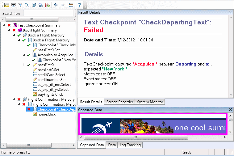 In the following example, the details of the failed checkpoint indicate that the expected results and the current results do not match. The expected value of the flight departure is Paris, but the actual value is Frankfurt.