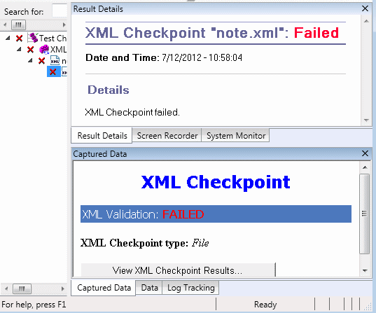 If the checkpoint failed, you can view details of each check performed in the checkpoint by clicking View XML Checkpoint Results in the Captured Data pane. The XML Checkpoint Results window opens, displaying details of the checkpoint's failure.