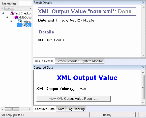 From the Captured Data pane, you can view detailed results by clicking View XML Output Value Results to open the XML Output Value Results window.