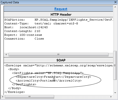 The following example shows the Request and Response captured data for the GetFlights operation from the sample Web Service.