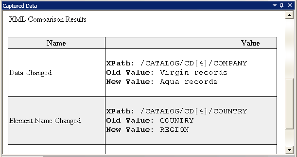 The Compare XML activity provides its results in the Captured Data pane. It indicates the changes in the XML, such as data changed or which element names changed.