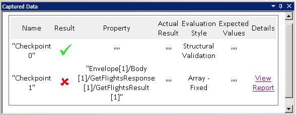 When you select the Checkpoints node in the left pane, the Captured Data pane provides a list of the checkpoints, their expected values, and actual results. In the case of a checkpoint in the form of an array, the Captured Data pane provides a link to a checkpoint report.