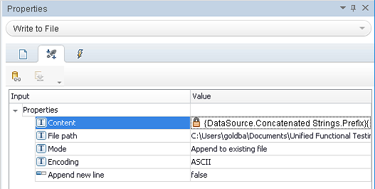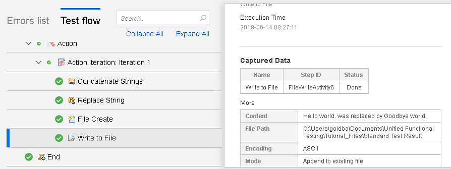 When the test run is complete, view the run results for the Write to File step you parameterized.