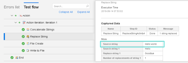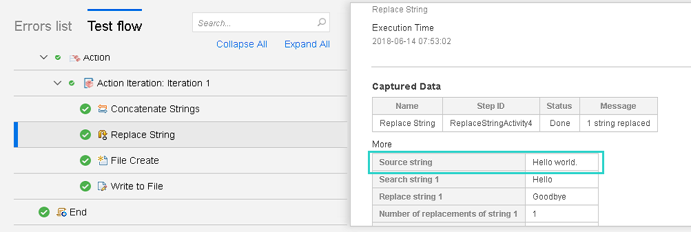 In the Test flow, click the Replace String node and view the Captured Data on the right.