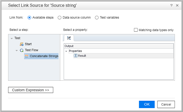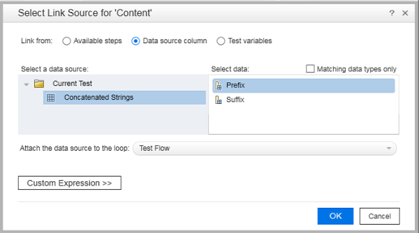 Parameterize your test with custom expressions to pull step values from a variety of places, such as by entering them manually, data sources, or output values of previous steps.
