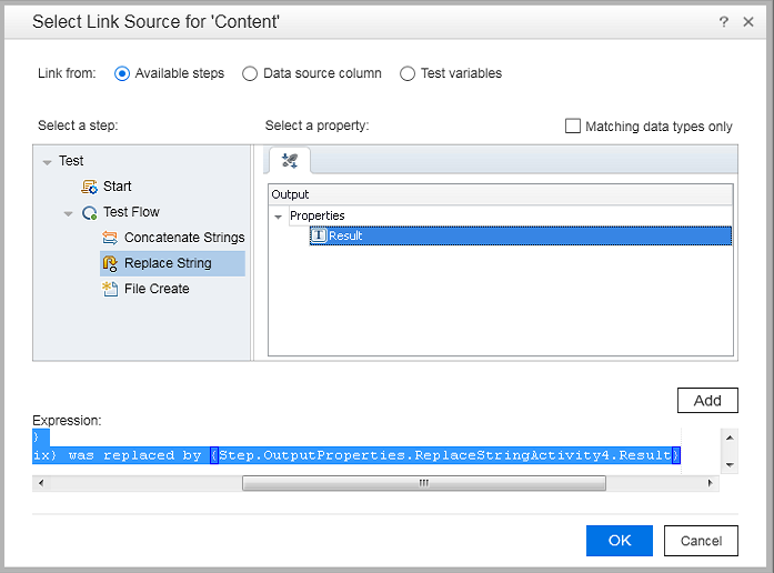 Click OK to close the dialog, and note how the Source string value in the Properties pane is updated with a link to the output from the Concatenante Strings step.