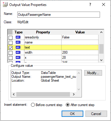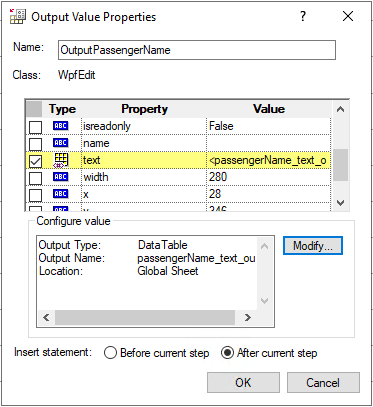 4. In the Output Value Properties dialog that appears, in the Name field, enter OutputPassengerName.