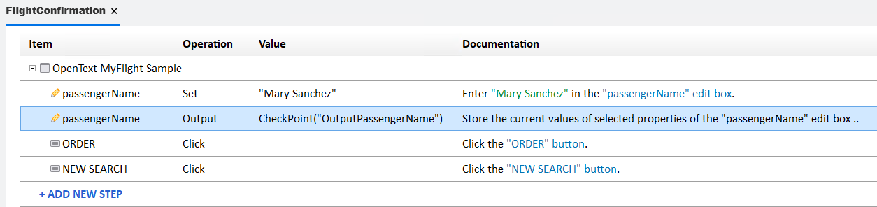 OpenText Functional Testing adds an output step after the passengerName Set step.