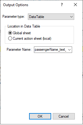 • Ensure that the DataTable parameter type and the Global sheet are options are selected.