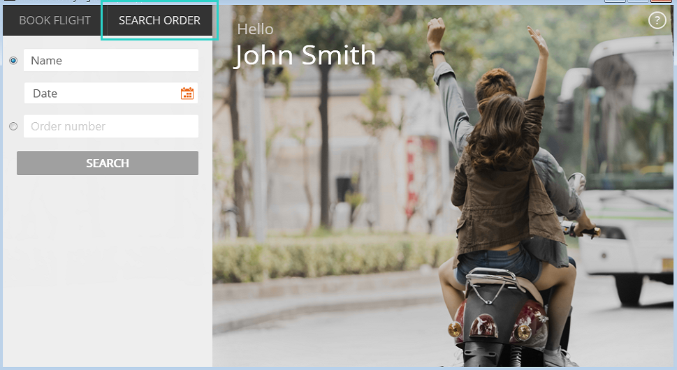 The MyFlight GUI sample app has a second tab for the SEARCH ORDER page, which enables you to search for previous flights reserved.