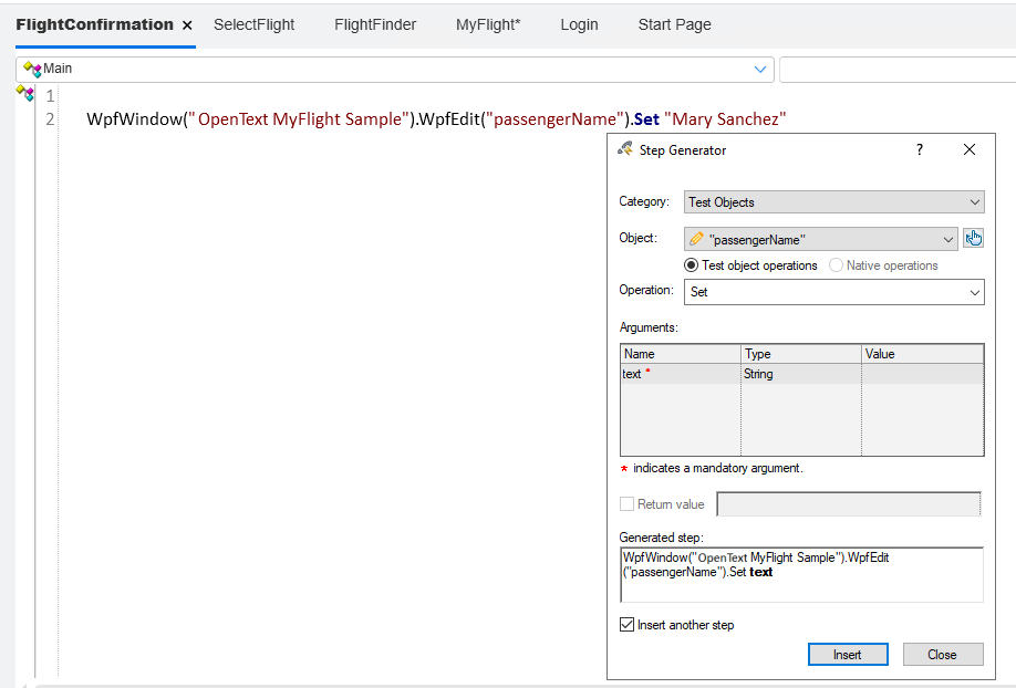 This procedure describes how to add steps to the FlightConfirmation action using OpenText Functional Testing's Step Generator.