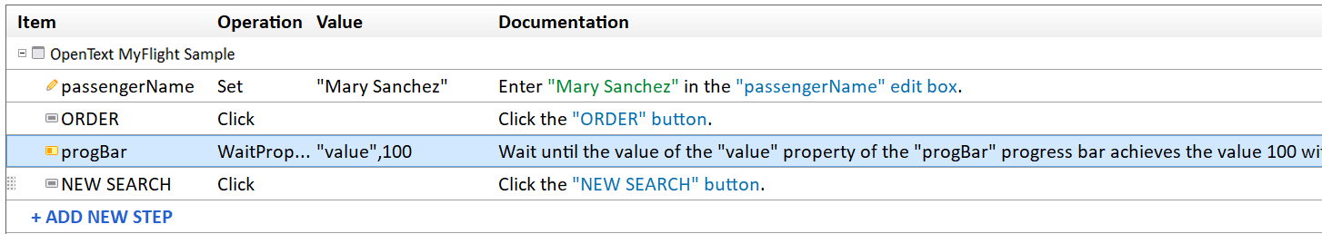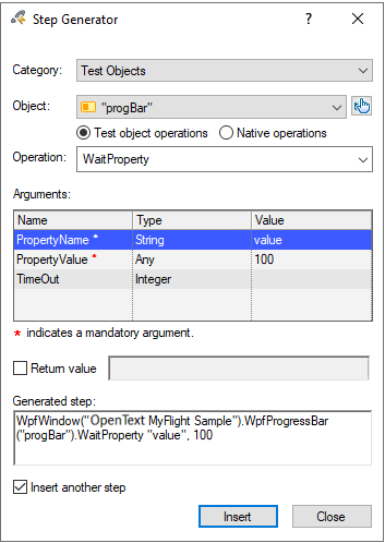 WpfWindow("OpenText MyFlight Sample").WpfProgressBar("progBar").WaitProperty "value", 100