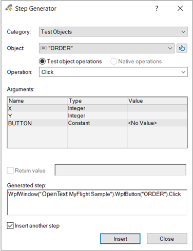 WpfWindow("OpenText MyFlight Sample").WpfButton("ORDER").Click