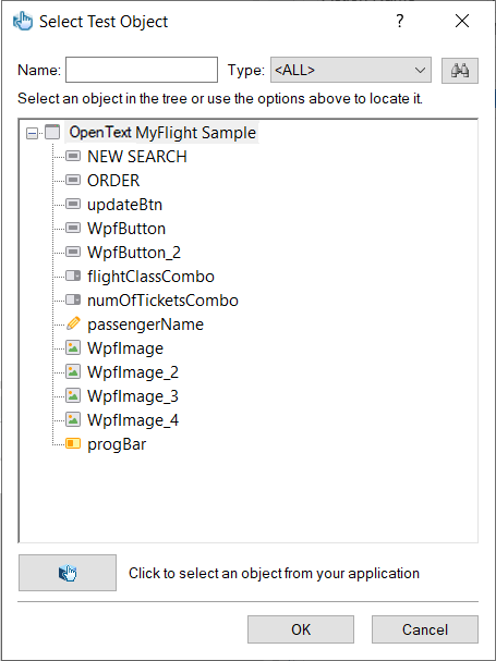 In the Select Test Object dialog, expand the OpenText MyFlight Sample node, and select the passengerName edit box object.