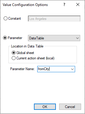 5. In the Value Configuration Options dialog that opens, leave the default Parameter selection, and define the parameter name as fromCity.