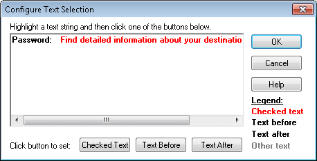- To remove text from the current text selection configuration, highlight only the text you want included as the before or after text and click the appropriate button. Any text that is not selected as Checked Text, Text Before, or Text After is displayed in gray. The gray text is not displayed the next time the Configure Text Selection dialog box is opened.