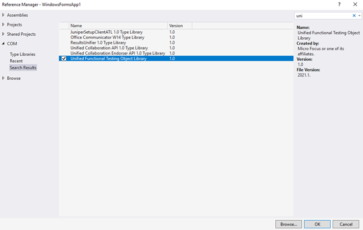 Then select OpenText Functional Testing <Version> Object Library (where <Version> is the current installed version of the OpenText Functional Testing automation type library).