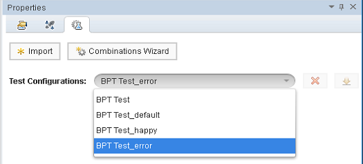 To open the Test Combinations Generator, select the Properties pane > Test Configurations tab and click the Combinations Wizard button. For example: