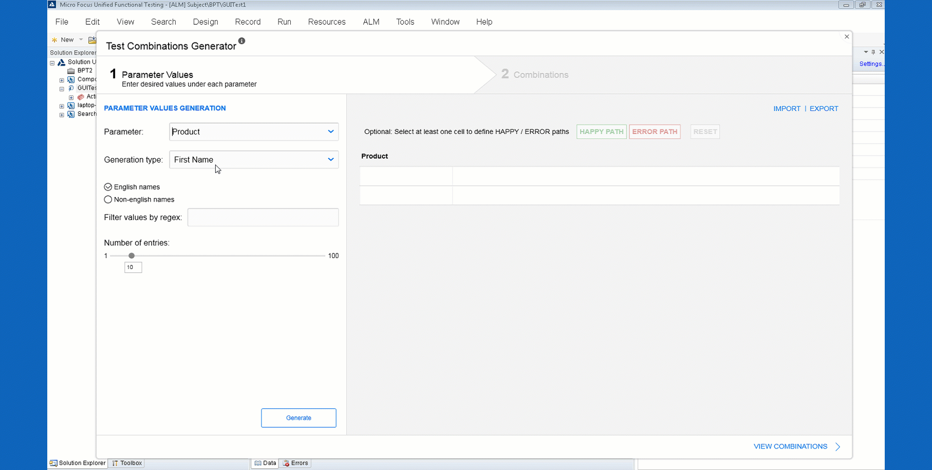 If OpenText Functional Testing's default dictionaries for generation do not suit your needs, create a custom data generator for the parameter types in your test: