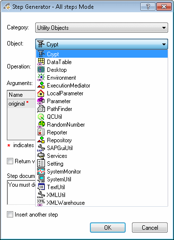 Note: The image above displays the list of Utility objects that are available when you open the Step Generator from the Keyword View. When you open the Step Generator from the Editor, the list includes a number of additional Utility objects. If you have one or more add-ins loaded, the list may include additional Utility objects for those add-ins.