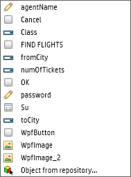 The test objects available in the Item list are the sibling and child test objects of the previous step's test object, as defined in the object repository. The example below shows the objects available for the Flight Finder page of the demo application:.