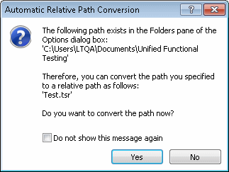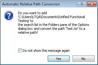 You can specify to always save your test's resources with relative paths in the Folders pane. In this way, you do not need to get prompted every time you add a resource to your test. For details, see Specify the resource path type.