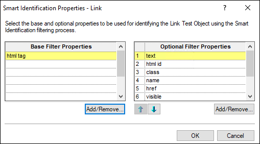 The Smart Identification process starts by identifying several link objects that match the base filter properties definition (html tag = A). These are considered to be the object candidates, which are then checked against the Optional Filter Properties list.