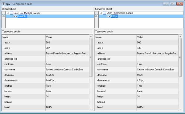 OpenText Functional Testing displays details about both of your spied objects side by side, using both an object tree hierarchy and a list of properties.