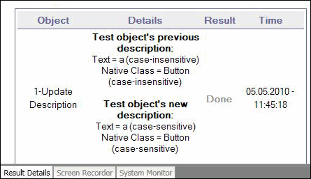 In some cases, the case-sensitivity of some description properties may change from one version of OpenText Functional Testing to the next, or as a result of a patch or hotfix installation. In those cases, when you use Update Run to update test object descriptions, OpenText Functional Testing also updates any case-sensitivity settings that may have changed. Below is an example of the run results for a step in which the case-sensitivity of some description properties were updated from case-insensitive to case-sensitive.: