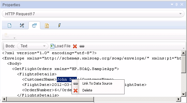 Create a test step that uses XML text in the request body. This applies to Network and XML type activities. If you intend to parameterize the data with a data source, import or create the data source.