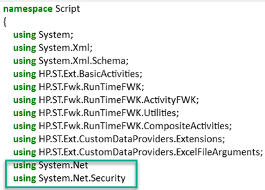 5. Within the brackets, replace the //TODO: Add your code here... string with a statement that instructs OpenText Functional Testing to use the TLS protocol: