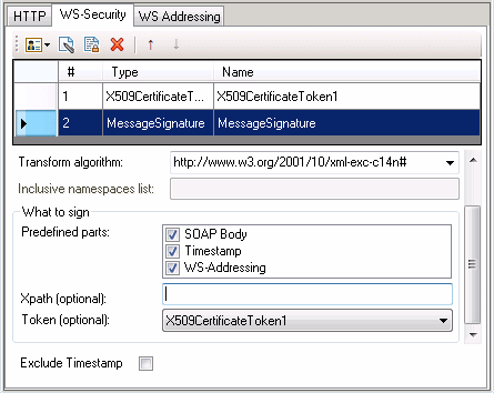 • To sign a SOAP Body, Timestamp, or WS-Addressing, select the checkbox in the Predefined parts area.