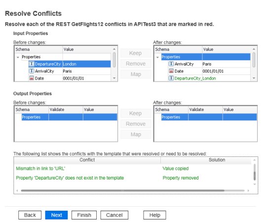 On the Resolve Conflicts wizard page, define the values you want to keep, remove or map (using the buttons between the change tables).