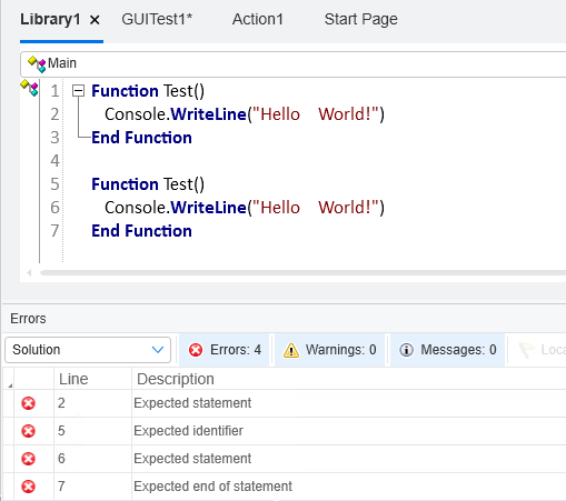 When the Errors pane for your test, component, or function library indicates inexplicable syntax errors, consider that your document might contain invisible erroneous NBSP characters. These are sometimes inserted accidentally when copying code from other places into OpenText Functional Testing.