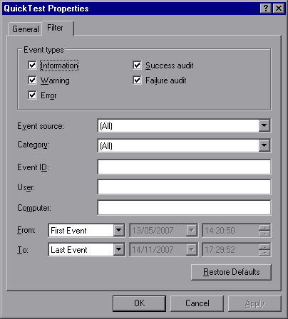 To view the event log and analyze the performance of your toolkit support set, open the Event Viewer (in Windows XP and Windows 2000, select Start > Settings > Control Panel > Administrative Tools > Computer Management, expand the Event Viewer node in the Computer Management tree) and select the OpenText Functional Testing node. Double-click a specific log entry to see its text.