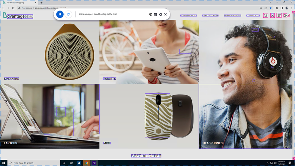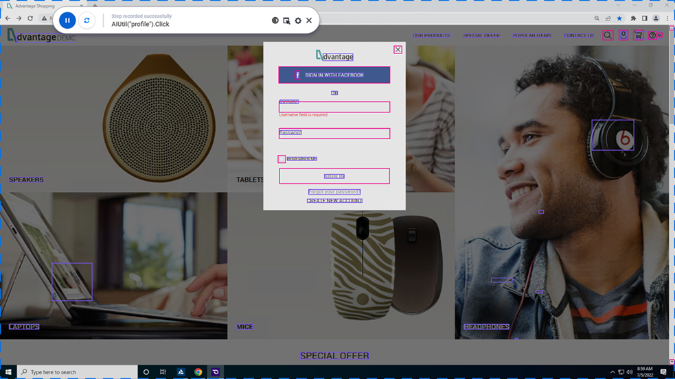 この実習では,AI レコードを使用して,Advantage Online Shopping サイトでアカウントにログインするテスト・ステップを記録する方法について説明します。