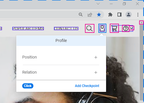 AI レコードが,[Profile]アイコンをクリックするステップをエディタに追加し,新しいページを検査します。