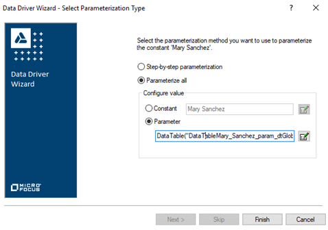 4. データ・ドライバ・ウィザードで,[すべてパラメータ化する]および[パラメータ]を選択します。