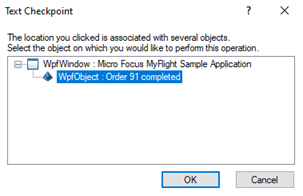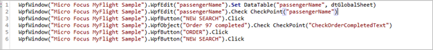 WpfWindow("Micro Focus MyFlight Sample").WpfObject("Order 91 completed").Check CheckPoint("CheckOrderCompletedText")